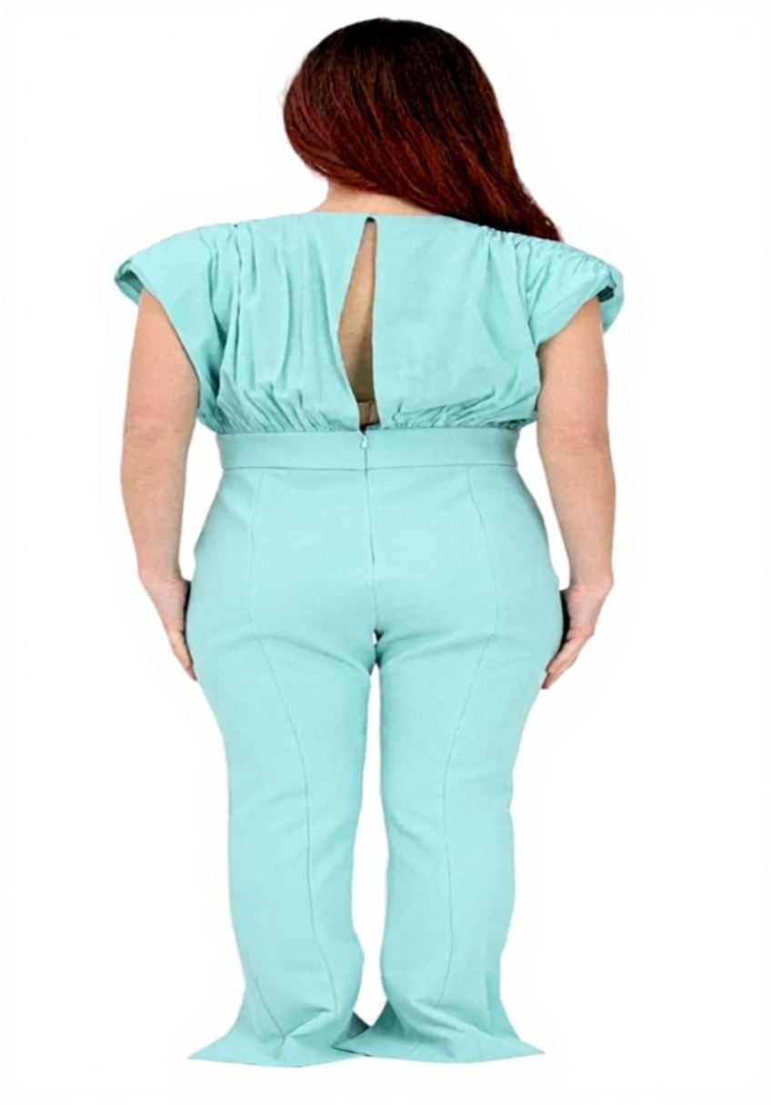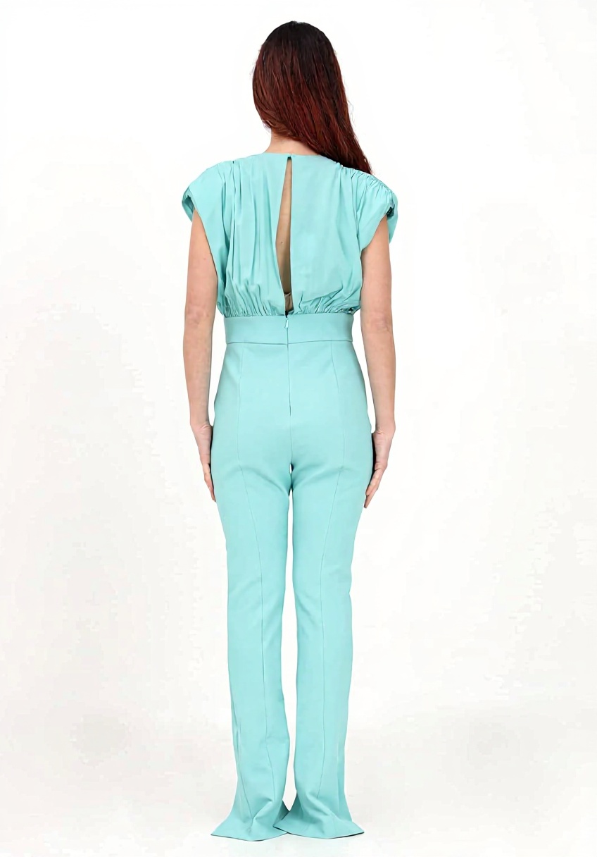 La combinaison est disponible en tailles 36 et 38, avec une couleur vert d’eau uniforme. Le mannequin de référence porte une taille 40 et mesure 170 cm, ce qui aide à visualiser la coupe. Le modèle numéro 8338846286151 est produit par la marque Pinko, garantissant une finition soignée.