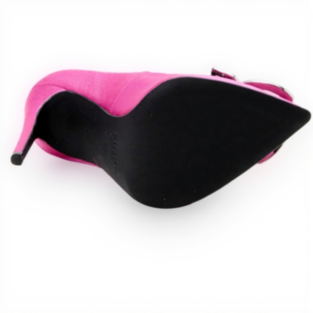 Disponibles en tailles 36 et 38 EU, ces escarpins présentent une pointure standard avec un embout légèrement arrondi pour un confort optimal. Le matériau principal est du satin souple et résistant, avec une semelle intérieure rembourrée pour un maintien adapté. Le talon mesure environ 8 cm pour une silhouette élégante sans compromis sur le confort.