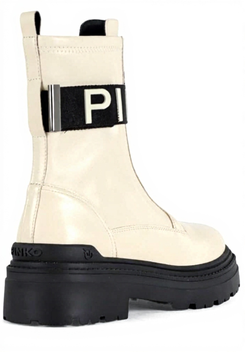 Modèle : Pinko Bottines Amphibiens Mia 13 SD0219P061, couleur crème, taille 40 EU. Dessus et doublure en cuir, talon plat, tige de hauteur cheville, largeur de chaussure moyen, fermeture par boucle. Référence constructeur : SD0219P061.