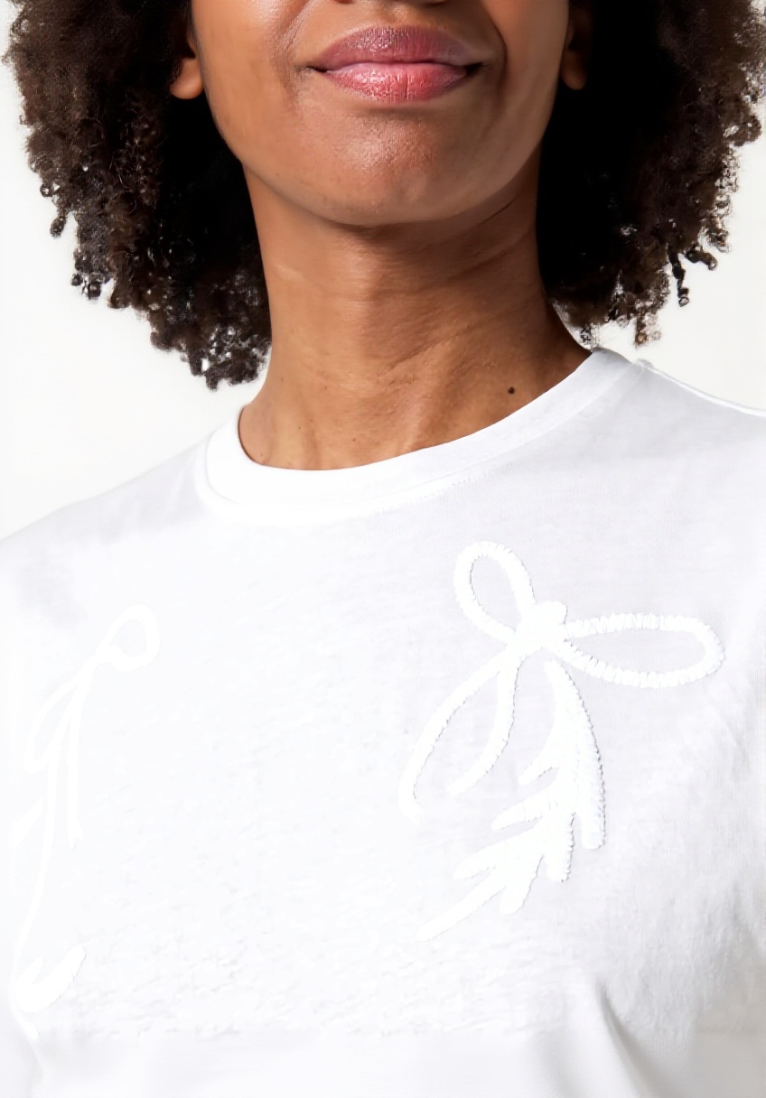 Ce t-shirt se distingue par son tissu en jersey doux et respirant, avec un design caraco qui ajoute une touche d’élégance. L’imprimé subtil et la coupe ajustée offrent une silhouette flatteuse, tandis que les manches courtes assurent un confort optimal tout au long de la journée.