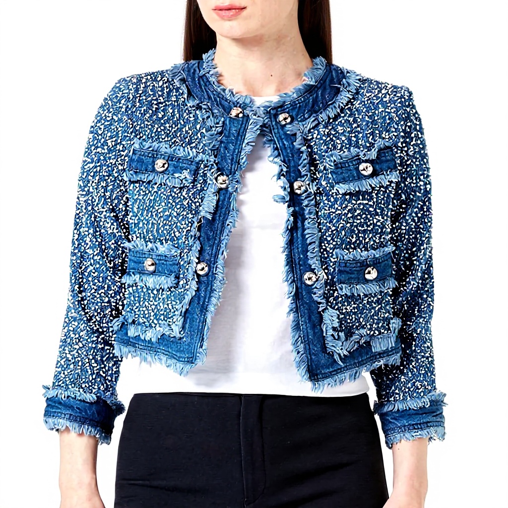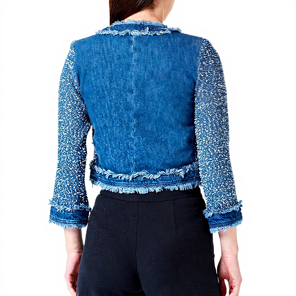 - Combinaison de denim et tweed pour un look distinctif et résistant.